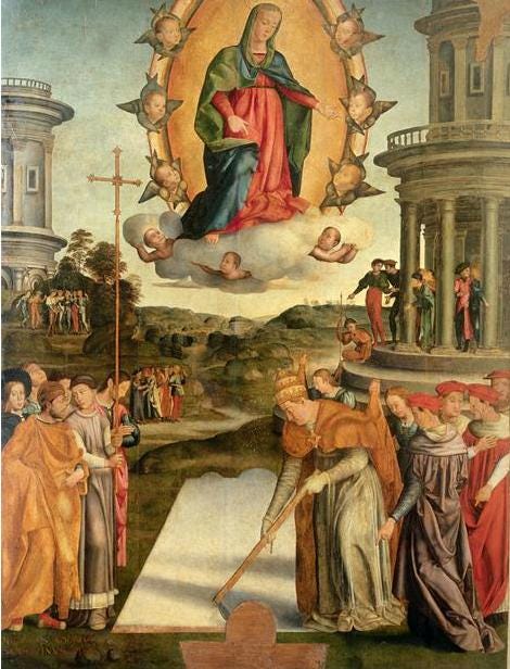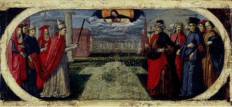 Masolino and Masaccio, 1482 The Blessed Virgin Mary Overlooking Pope Liberius as he Scraped the Basilica’s Foundation in the Snow (The Miracle of the Snow), 1428, Galleria Nazionale di Capodimonte, Naples.