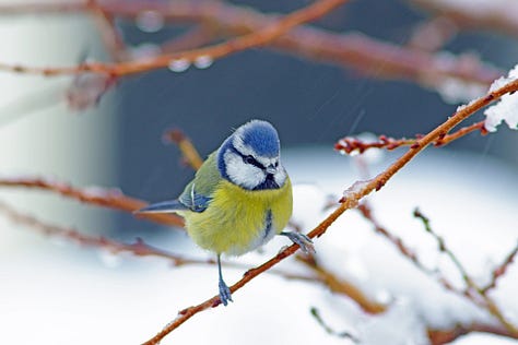 And this is where the soft labour of a -possibly returning- blue tit family, fissures the brittle day: it calls attention to the vast and omnipresent, if individually diminutive, bird population which tirelessly festoons cold air and bare branches with colours we can only truly notice at barren times of year. Times when we aren’t distracted by blossom or butterflies, foliage, a blazing sun, the cooing of woodpigeons, the hum of bumble bees or the call of a confident fox.